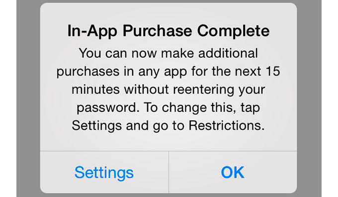 Новое предупреждение выводится после совершения любой встроенной покупки. В нем отмечается, что после ввода пароля в течение пятнадцати минут можно совершать другие покупки в App Store и приложениях без повторного запроса на ввод пароля. Пользователю предлагается либо согласиться и продолжить, либо изменить этот нюанс в настройках, куда и ведет соответствующая кнопка.