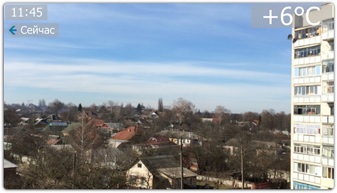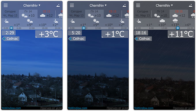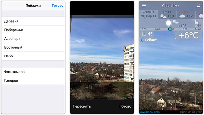 Как вы видите, я сделал снимок и тут же использовал его в качестве пейзажа для YoWindow. Причем фотография сразу адаптируется под портретный и под ландшафтный режимы работы приложения. Но это еще не все. Полученный пейзаж, как и встроенные, становится интерактивным и так же визуально демонстрирует изменения погоды и времени суток: