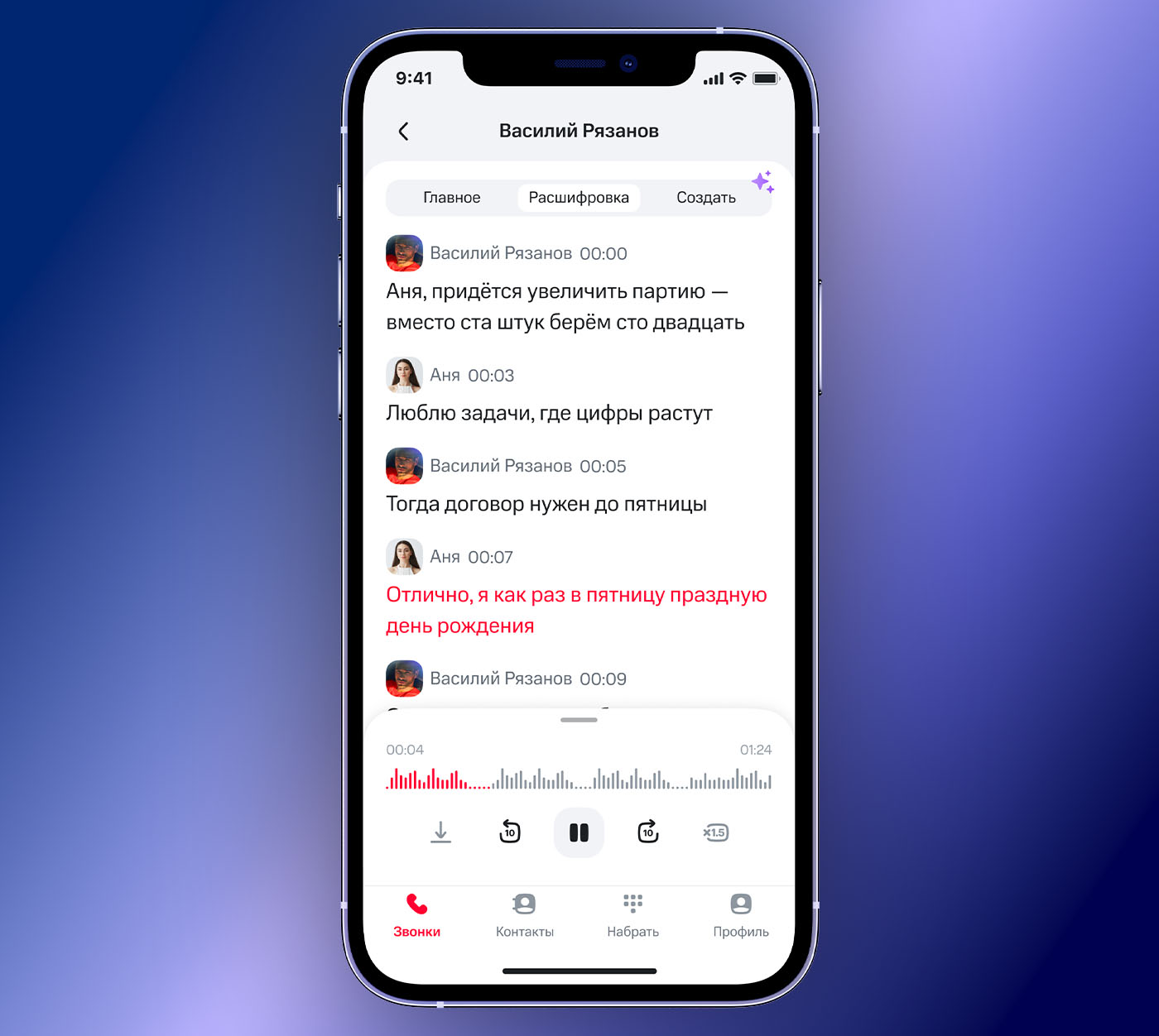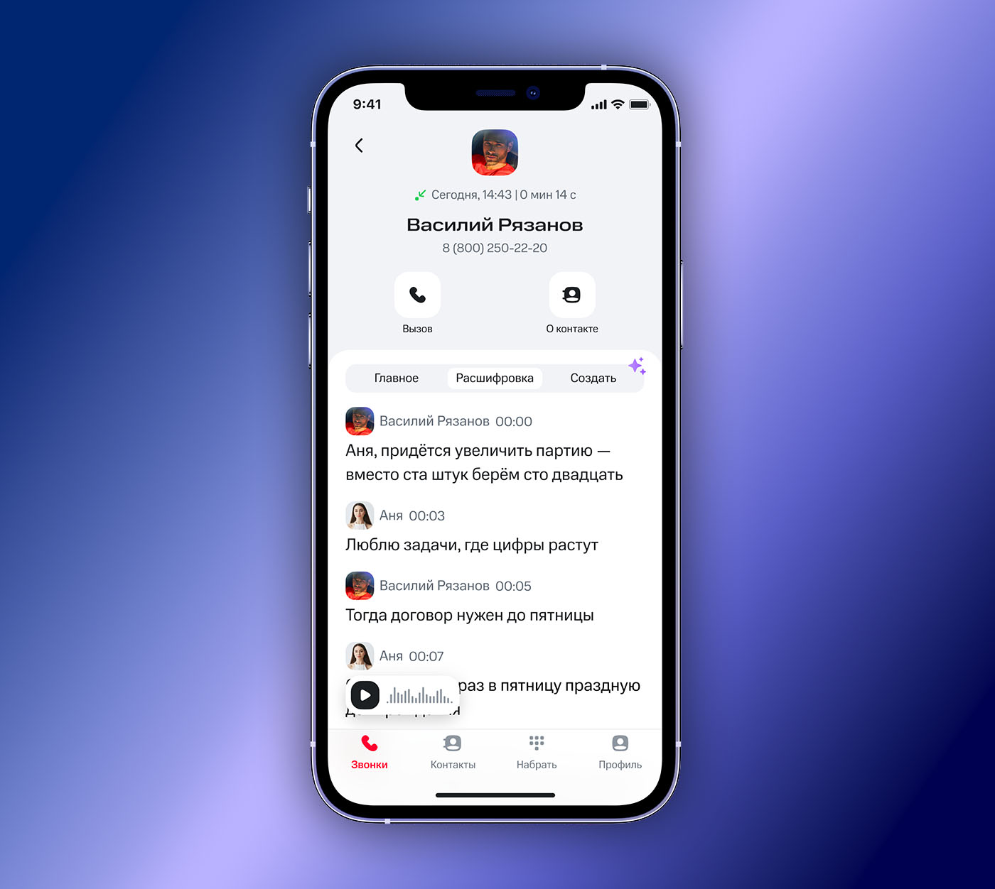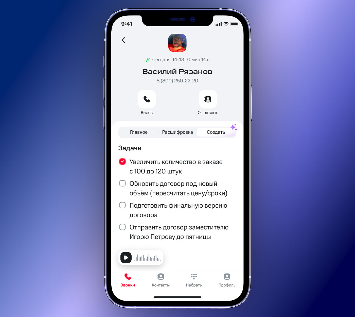 Идея понятная: вместо того чтобы крутить разговор в голове или переслушивать его целиком, вы открываете карточку звонка и сразу видите, что обсудили, и что стоит делать после разговора.
