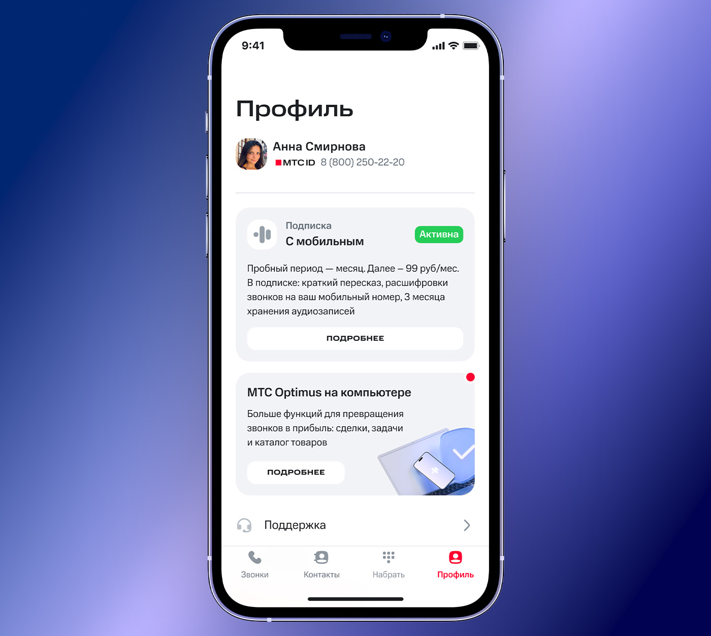 После этого вам прилетит SMS с подтверждением и ссылкой. Далее скачиваете приложение МТС Optimus (App Store, Google Play), авторизуетесь через МТС ID, подтягиваете номер. Всё, сервис начинает «цепляться» к входящим и исходящим звонкам.