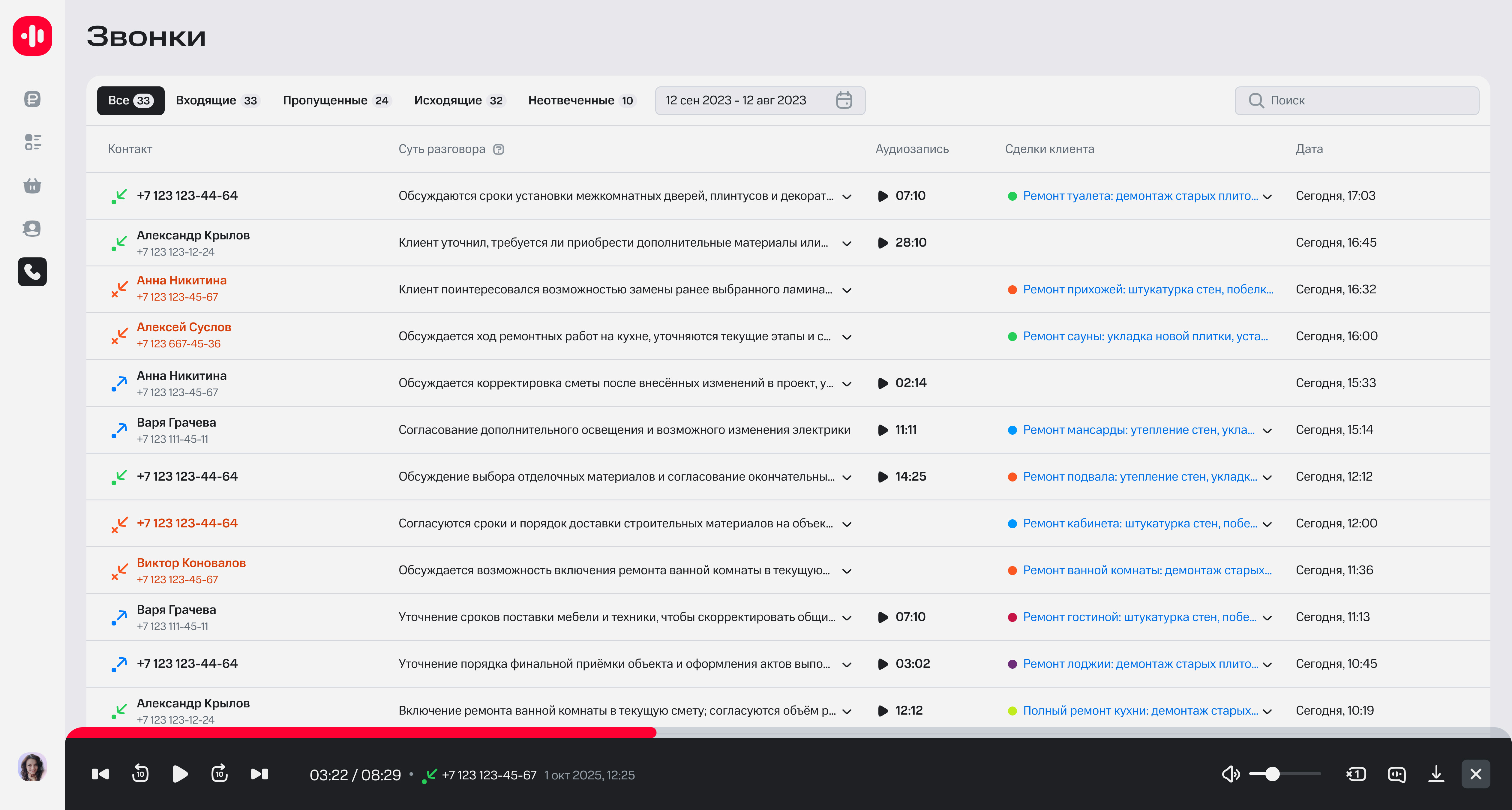 Открываете конкретный звонок, и сверху краткие итоги, ниже полный текст, ещё ниже ссылка на аудиозапись. При желании можно переслушать кусок, если вдруг текст кажется сомнительным. В карточке клиента видно, какие разговоры у вас были и какие задачи с ним связаны.