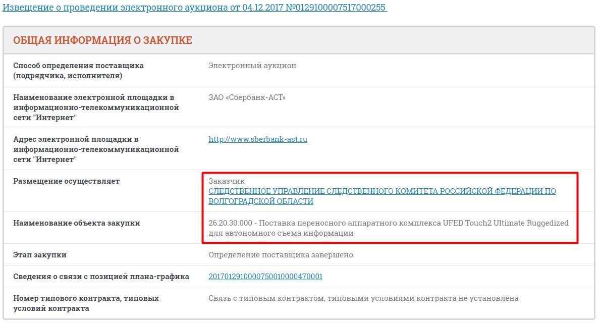 Так, Волгоградское управление СКР купило переносной аппаратный комплекс UFED Touch2 Ultimate Ruggedized для автономного съема информации за 800 тыс. рублей.