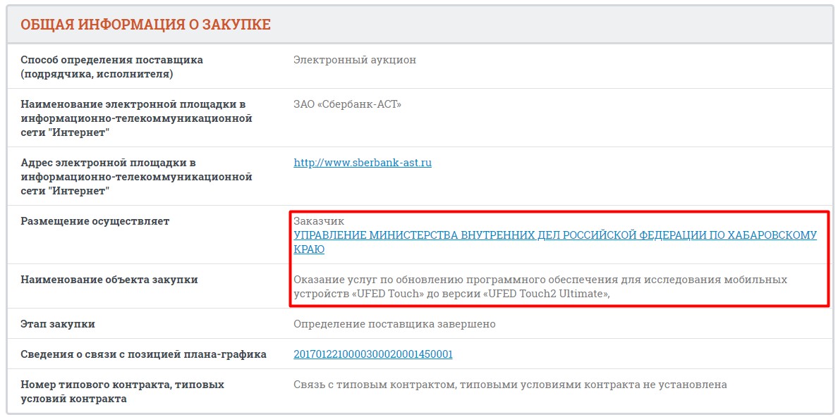 Хабаровское – обновило программное обеспечение «для исследования мобильных устройств UFED Touch до версии UFED Touch2 Ultimate» на двух устройствах за 1,26 млн рублей.