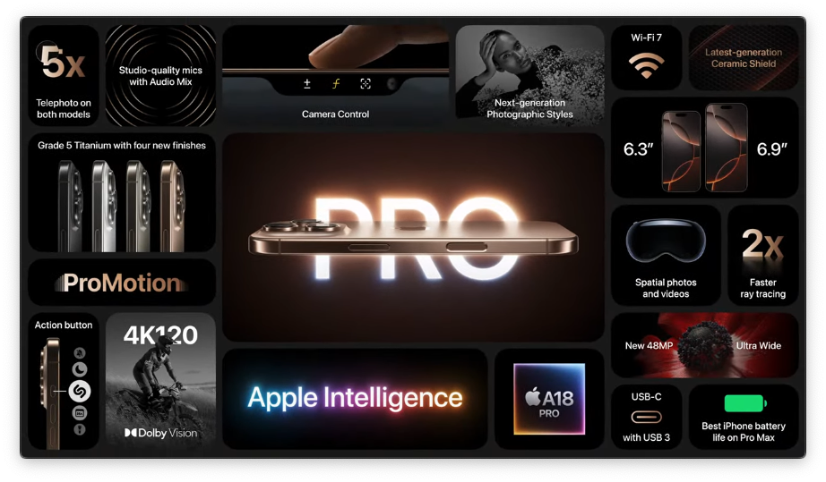 ◉ Линейка iPhone 16 Pro получила увеличенные диагонали экранов. Базовая модель теперь имеет диагональ – 6.3″, а увеличенная – 6.9″.