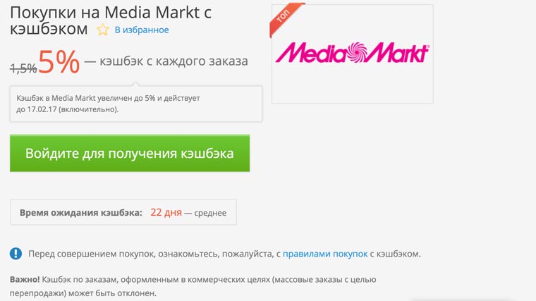 Почти всё готово. Заходи в раздел MediaMarkt на LetyShops, переходи туда по кнопке «Перейти в магазин» – и забирай 10% в виде бонусов при покупке устройств Apple.