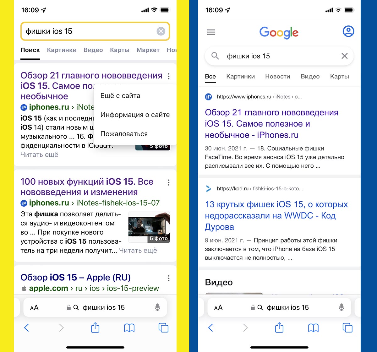 Отличие поиска Google в том, что он покажет лишь часть необходимой информации, а за остальными пунктами перенаправит на сторонний сайт.