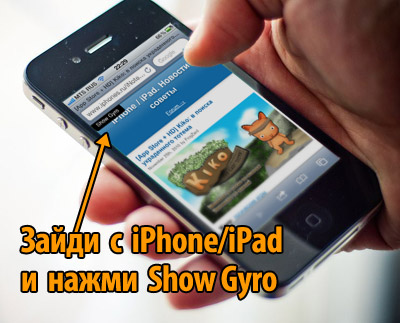 Зайдите на iPhones.ru с iPhone/iPod Touch/iPad, предварительно включив блокировку вращения экрана (это нужно для сохранения координат во время движения объекта), а потом нажмите в левом верхнем углу надпись Show Gyro. Вы увидите червя, который будет ползать по странице, следуя наклонам экрана влево-вправо, вверх-вниз.