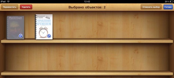 Самой ожидаемой стала функция Коллекция, которая доступна в iBooks ver.1.2 для iPhone/iPod и iPad. В левом верхнем углу появилась кнопка с одноименным названием: в этом меню можно просмотреть существующие папки с книгами или создать новую. Для того, чтобы переместить файлы в нужную папку, необходимо тапнуть на кнопку Правка, далее выбрать нужные книги и после нажатия на Переместить выбрать соответствующую папку. Apple также реализовала новый способ для перемещения по своим сборникам — происходит это с помощью свайпов слева направо и наоборот.