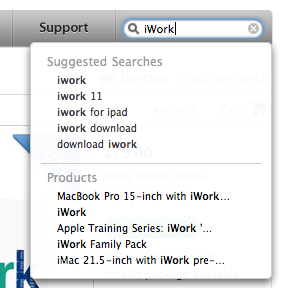 Не в меру любопытные iМаньяки в течении всего вчерашнего дня могли наблюдать интересные результаты поиска по сайту Apple.com. В окне предположений, основанных на введённых пользователем данных, при попытке ввода слова «iWork» выпадало сочетание «iWork 11». Правда, лавку прикрыли достаточно быстро, сразу после появления соответствующей публикации на профильных сайтах.