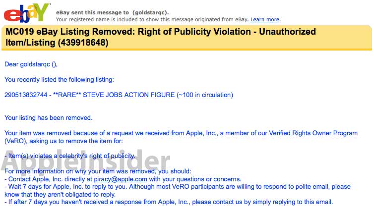 Продавец из Канады чуть было не заработал на 80-долларовой фигурке без малого тысячу долларов. Если быть точными, её стоимость в ходе торгов поднялась до 1,125 долларов. Закрепить продажу на деле не удалось по причине блокировки дальнейших операций по лоту со стороны eBay. Сама администрация объясняет свои действия выполнением обязательств перед Apple, от которых было получено официальное требование разобраться с фигуркой, «нарушающей право знаменитости на частную жизнь».
