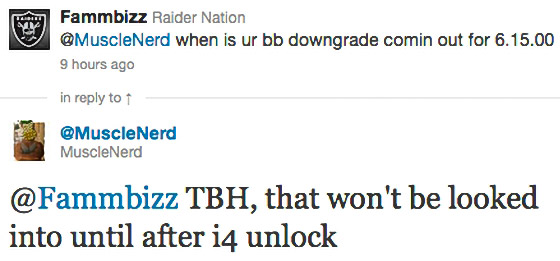 В Twitter-блоге Dev Team один из пользователей поинтересовался, когда выйдет метод даунгрейда бейзбенда 06.15.00, который является наиболее удачным для анлока с помощью UltraSn0w. На что известный хакер, MuscleNerd, ответил, что сейчас для команды работа с iPhone 4 является более важной. Конечно, это может несколько расстроить владельцев других моделей аппарата, но внушает большую радость всем пользователям заветной четвёрки.