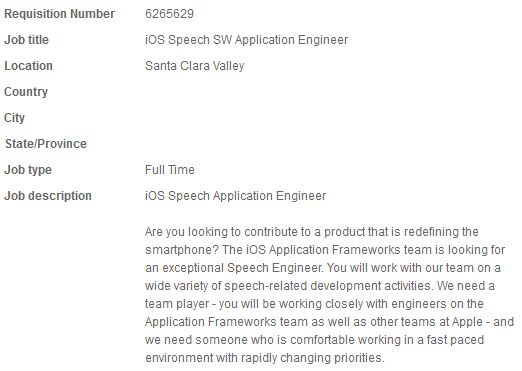 Тем интереснее для нас с вами становятся крупные вакансии на сайте купертиновцев. Как правило, каждая из них может сказать много о процессах, происходящих «за кулисами». Вслед за картографическими, Apple требуются специалисты в сфере распознавания голосовых команд.