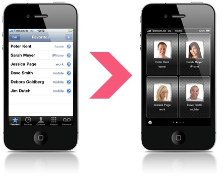 Управление производится с помощью акселерометра и движений по экрану. К примеру, чтобы позвонить выбранному контакту, надо провести носом по дисплею айфона снизу вверх. Настроек здесь минимум. Однако визуальное оформление поддаётся изменению. Впрочем, на данный момент предустановленные варианты выглядят как-то не очень симпатично. Оригинальная «сетка» в стиле прошлого дока в iOS намного лучше. В будущих апдейтах могут появиться и другие варианты «ре-дизайна».