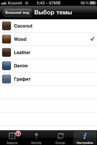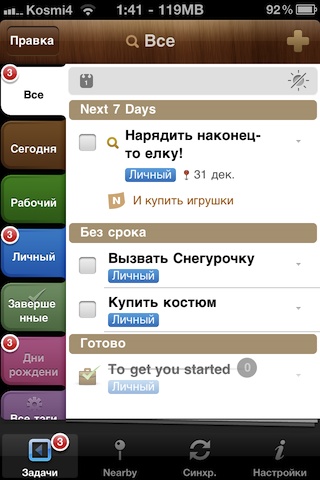 Приложение является продвинутым планировщиком задач и распространяется за 7 американских долларов. Сумма немаленькая, но далее вы поймете, что программа того стоит. Весь список дел и задач находится в вертикальном списке, который разбит на несколько частей-закладок: Все, Сегодня, Рабочий, Личный, Завершенные и, конечно, Дни Рождения. Все эти пункты могут быть изменены пользователем в настройках, можно также добавить новые, переименовать старые и расставить их так, как душе угодно. В нижнем доке находятся четыре иконки. Задача со списком всех дел, Nearby, которая будет отображать ближайшие по месту выполнения заметки, на которых вы проставили местоположение и два очень интересных пункта — Синхронизация и Настройки, но о них позже.