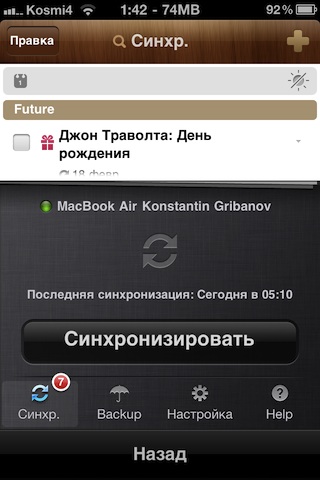 Маленькая программа позволит сделать бэкап всех заметок, синхронизирует ваш мобильный календарь с компьютерным (iCal, Outlook и MobileMe). Здесь же можно сделать резервное копирование через Email и браузер. Если у вас есть и iPad, то с помощью этой программы можно перенести все заметки на него, ведь приложение 2Do — универсальное и нужно этим пользоваться.