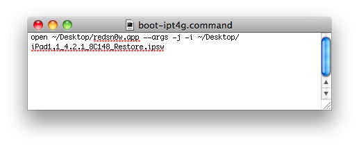 open ~/Desktop/redsn0w.app –args -j -o -i ~/Desktop/iPhone2,1_4.2.1_8C148_Restore.ipsw