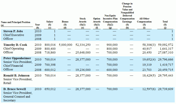 Документы были подготовлены и выпущены в свет Комиссией по ценным бумагам и биржам США (SEC). Помимо Кука, в них фигурируют и некоторые другие члены «верхушки» Apple. К примеру, Брюс Сьювелл, главный советник и старший вице-президент Apple, заработавший 650 тысяч долларов за 2010-й и получающий 50-тысячную прибавку в текущем году.