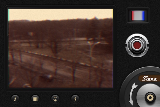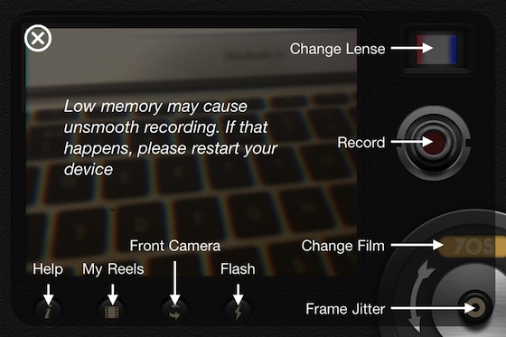 Чуть правее от видоискателя находится клавиша смены линз, которых в программе целых пять штук: обычная линза, режимы дрожащей рамки, затемненных углов, слабого освещения и размытия. По середине правого блока управления, как раз под большим пальцем правой руки, расположена кнопка Rec для старта записи. Приложение было не полноценным, если бы в нём не было дополнительных пяти пленок. В колесико смены пленки встроена особенная кнопка, которая имитирует смену кадра, как это было на камерах прошлого века.