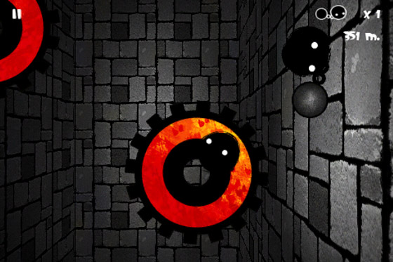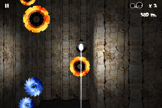 Управление происходит при помощи двух виртуальных клавиш, расположенных слева и справа. Одна отвечает за прилипание к какому-нибудь объекту, а вторая – за прыжок. «Дымок» может немного ползать по стенам, пружиня от них через маленький промежуток времени и зависать на движущихся предметах в ожидании удачного момента для следующего манёвра. Надо заметить, что направление прыжка определить довольно трудно. А прыгает ваш герой, в прямом смысле, «куда глаза глядят», если две белых точки на нём можно назвать глазами.
