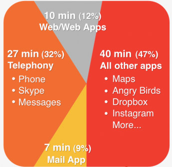 Результаты оказались впечатляющими, пусть и довольно ожидаемыми. Пользователи iPhone предпочитают приложения из App Store, имея на своем устройстве около 108 программ. Исследования показывают, что 20 из них поставляются вместе с iOS и 88 установлены из магазина. При этом 58% приложений – бесплатны, 23% – куплены и 19% установлены по-умолчанию. На web-приложения тратится всего 10 минут в день из 84 минут общего использования гаджета. Пользователи Appsfire тратят около 10% времени на телефонные звонки и около 47% на прочие программы, вроде игры в Angry Birds или изучения Google Maps. На работу с почтой приходится всего 7 минут, что составляет 9% от общего времени работы с устройством.