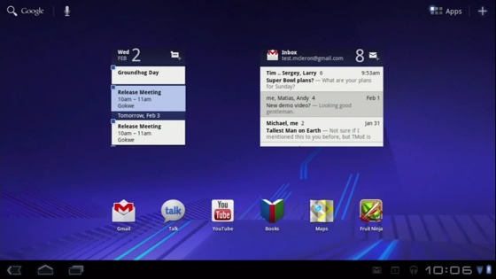 Виджеты в Android 3.0 превратились в своего рода приложения в маленьком окне. Они стали намного более функциональными, чем в предыдущей версии ОС. Так, есть виджеты в виде прокручивающихся списков, сетки из миниатюр (например, фотографий) и даже стеки. Считал и считаю виджеты крайне положительной стороной Android, которой не хватает в iOS о чем в свое время упоминал в соответствующей статье. В своей новой реинкарнации они делают использование планшета крайне удобным.