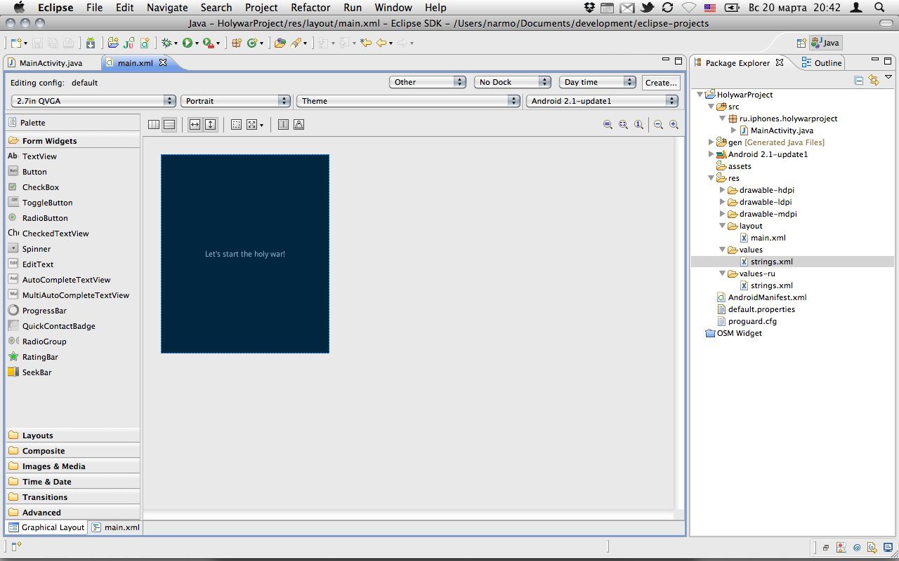 В ADT для Eclipse также имеется визуальный редактор интерфейсов. Он гораздо проще и менее функционален, чем Interface Builder. Но здесь в любой момент можно переключиться в текстовый режим (файлы пользовательских интерфейсов ― это простые XML-файлы) и отредактировать нужные параметры: например, задать методы, вызываемые на различные действия. Справедливости ради стоит отметить, что файлы XIB, редактируемые Interface Builder’ом, тоже являются файлами в формате XML, но редактировать их вручную не имеет смысла.