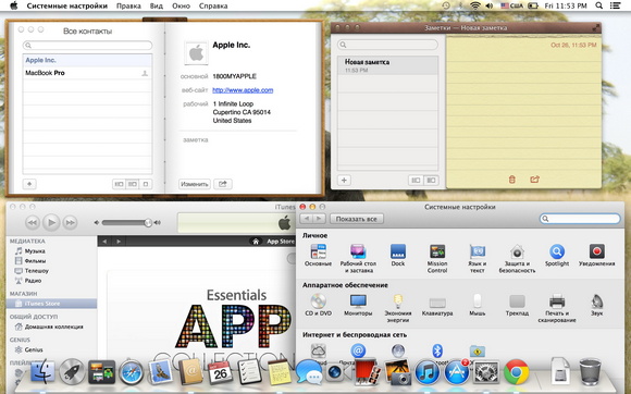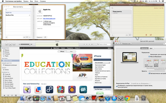 Первое включение ноутбука заняло меньше семи секунд — еле успел сфотографировать — и перед нами бодро раскинулся приветствующий экран OS X Mountain Lion. Естественно, все новые 13-дюймовые MacBook Pro продаются вместе с OS X 10.8.1. На компьютере предустановлен пакет iLife ’11, включающий в себя видеоредактор iMovie, звуковой редактор Garage Band и пакет для каталогизации и обработки фотографий iPhoto. Эти три программы «цепляются» к вашему аккаунту Apple ID при первом их обновлении через Mac App Store и с тех пор считаются официально купленными. Всего система предложила три обновления, одно из которых было системным.