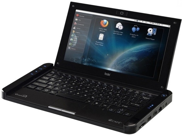 Дисплей в eCAFE 10,1-дюймовый с разрешением 1024х600 точек. Что касается начинки, то в Hercules использовали идею Apple с SSD-накопителем вместо HDD. Более того, ее доработали: в лэптопе установлено 8 ГБ флэш-памяти — это всего одна микросхема, огромная экономия внутреннего пространства устройства. В качестве процессора используется чип ARM Cortex-A8. Идея тоже подсмотрена у Apple. Раз компания использует этот процессор в iPhone 3GS, аналогичное ядро лежит в основе системы на чипе Apple A4, значит, можно применить его и для портативного ПК! Оперативной памяти в eCAFE 512 МБ, хитрые инженеры компании снова экономят внутреннее пространство устройства, вероятно, для лучшего охлаждения начинки.