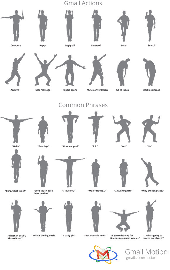 Работы над Gmail Motion велись последние два года. Для этого поисковик купил чикагскую фирму, специализирующуюся на оцифровке и распознаванию жестов. Когда вы стоите перед камерой ноутбука, то больше нет надобности стучать по клавишам. Устанавливать дополнительное ПО. Достаточно запомнить нужный вам набор жестов, подойти к камере и начать махать руками, чтобы Gmail через специальный «облачный» сервис составил за вас письмо. Вот эти жесты: