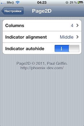 В Настройки.app можно установить нужное вам количество вертикальных колонок и включить «затухание» точек страниц спрингборда. Программа достаточно плавно работает, но при быстром листании страниц с иконками иногда чувствуются легкие подергивания. Если рука невольно тянется к Android OS с ее вертикальным скроллингом или просто хочется чего-то новенького для iOS, попробуйте установить Page2D из репозитория Bigboss за $1.99.