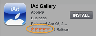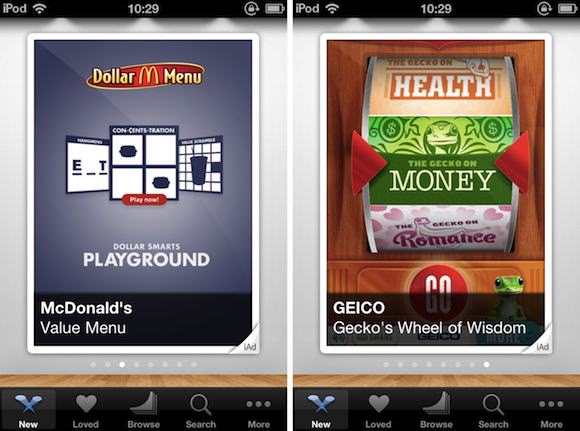 iAd Gallery уже доступна в App Store. Как многие уже догадались, приложение представляет из себя галерею рекламы. Ничего лишнего, никакого иного контента — только реклама iAd во всех возможных формах. Самые интересные образцы, на которые действительно стоит взглянуть разок, располагаются на первом экране в виде «карточек» с описаниями. Тут есть пара незамысловатых игр, интерактивные видео и еще несколько приличных образцов интересной рекламы, по которой мы никогда не щёлкнем в приложении.