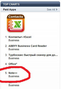С написанием приложения и с публикацией в App Store проблем не было. В первые две недели программу скачали более 400 раз. По сей день стабильно идет по 8-12 скачиваний по всему миру. Потом встала проблема раскрутки приложения. “Плохой” софт обычно скачивают 20 раз и забывают о нем. “Хорошие” приложения обычно выходят в Top или в Hot App (под покровительством Apple). Мое приложение Note++ повисло в неопределенности. И борется за Top по сей день. Оно имеет практическую ценность в своей тематике, поэтому его скачивают около 10 раз в сутки. Но пробить рубеж выше оно не может. Правда последние дни скачивания поднялись до 20 (причина даже мне не известна) и приложение заняло 5 место в своей категории.