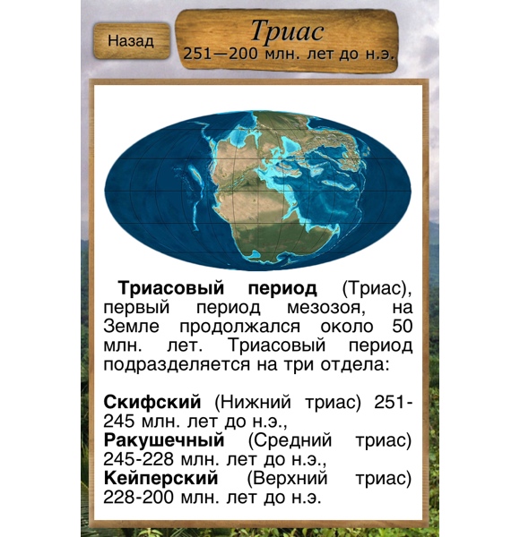 Из главного меню можно перейти к изучению периодов Мезозойской эры, динозавров (тех, что ходят и плавают) и птерозавров (они летают). Первый пункт меню не особо богат, всего три периода: Триасовый, Юрский и Меловой. Здесь можно кратко почитать, что они собой представляли и взглянуть на глобус тех лет. Информации не особо много, ну да это и не географическо-историческая энциклопедия.