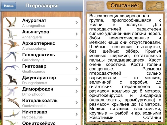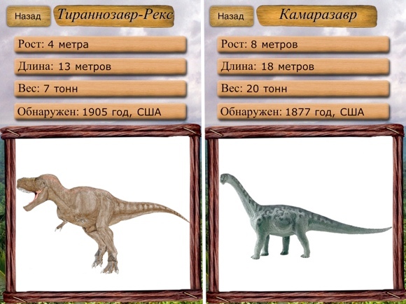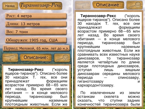 Информация о каждом динозавре включает его рост, длину, вес, когда останки были обнаружены человеком и в какой период рептилия проживала на планете. Кроме того, есть описание ящера, его изображение и интересные факты. При желании текстовую вставку можно развернуть на весь экран. Любые манипуляции с меню сопровождаются приятной анимацией.