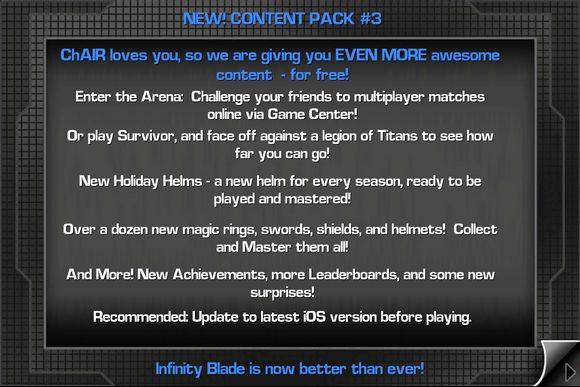 Для тех, кому такого обновления будет недостаточно, разработчики приготовили еще около 20 новых предметов экипировки, а также ввели новую систему «сезонных шлемов»: один из предметов будет меняться в зависимости от времени года или приближающихся международных праздников. Теперь экстремальная часть. Если вы еще не приобрели Infinity Blade — делайте это прямо сейчас, ибо цену на приложение сбросили в два раза — до трёх долларов. [iTunes link]