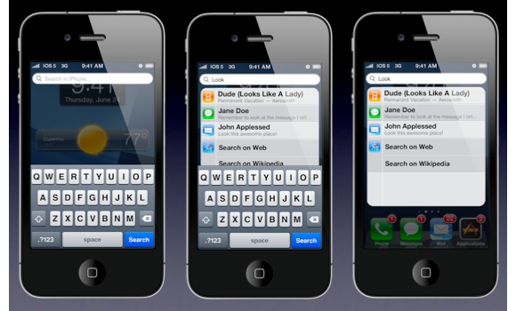 Система глобального поиска Spotlight тоже немного изменена. Для ее активации достаточно провести пальцем сверху вниз. В остальном все аналогично с текущим интерфейсом Spotlight в iOS.