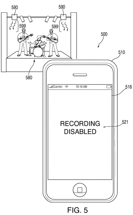 Перед нами очередной необычный патент от купертиновцев. В тексте описывается механизм, который поможет как одновременно расширить функционал видоискателя в iOS, так и ограничить возможности записи видео и съёмки фотографий во время Live-концертов. Над сценой или перед, скажем, музейным экспонатом вешается инфракрасный излучатель, направленный в сторону аудитории. Он работает в пассивном режиме и никак не взаимодействует с мобильными гаджетами, находящимися в руках у публики. Ровно до того момента, когда кто-нибудь не включит камеру и не направит её в сторону сцены.