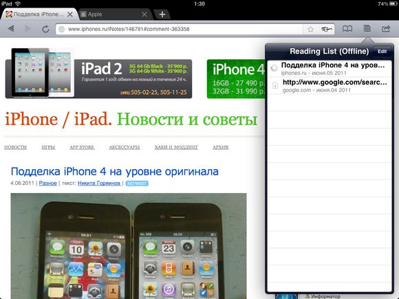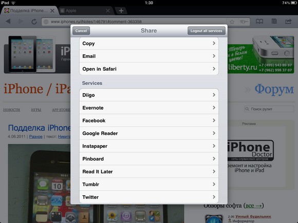 Несмотря на отсутствие настроек и общий минимализм, в iChromy есть несколько вполне полезных «фич». Естественно, здесь есть список закладок. Нужную страничку можно сохранить для просмотра без подключения к интернету. Страницы сохраняются без особых проблем, но иногда немного шалит кириллическая кодировка. Последняя функция, которую нам подарили разработчики — меню связи с внешним миром. Поделиться понравившейся ссылкой можно буквально со всеми во всех западных соцсетях.