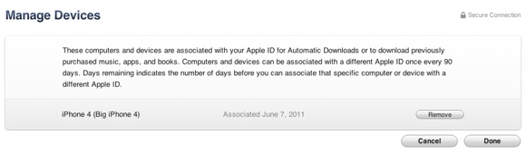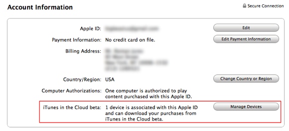 Новые опции были обнаружены в настройках учетной записи — «iTunes in the Cloud beta». В этом разделе можно убрать из списка ассоциированные с учетной записью iTunes устройства. Кстати, ассоциация проходит не мгновенно (необходимо на iГаджете выбрать автоматическую загрузку контента в настройках App Store). iPhone 4, в котором соответствующие опции были активированы несколько часов назад, появился в списке, а только что настроенный iPad 2 туда еще не попал.