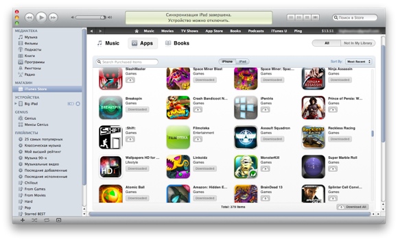 Далеко не сразу была замечена опция истории покупок. Пока это самый полезный и долгожданный для меня пункт. Ранее приходилось самостоятельно вести каталог купленных программ и использовать соответствующие сервисы. Например, AppShopper. Теперь это есть в iTunes. Можно просмотреть все когда-либо купленные приложения, либо только те, которых на данный момент нет в медиатеке. Имеется разделение между программами для iPhone и iPad, но в последнем случае вываливаются абсолютно все приложения, ведь iPad может запускать ПО для iPhone. Надеюсь, в будущем это глюк поправят, хотя в App Store на самом планшете сложностей в просмотре списка программ именно для iPad нет.