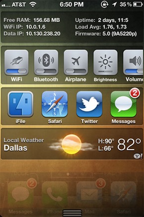 На скриншоте слева вы можете наблюдать работу музыкального виджета (MusicCenter widget), благодаря которому в Notification Center появляется полная информация о треке, который на данный момент проигрывается в iPod.app. На второй картинке показан виджет SpringPrefs, который выводит на экран актуальную информацию о состоянии вашего гаджета: количество свободной оперативной памяти, IP-адрес в сети, номер прошивки и другое.