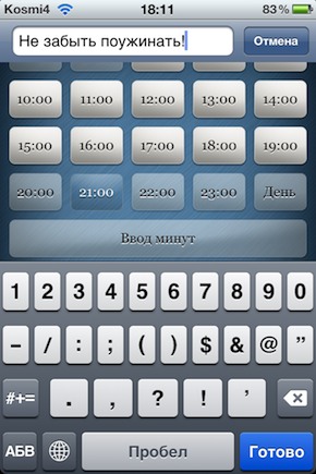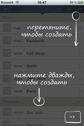 Для того, чтобы добавить задачу, необходимо тапнуть два раза по дню из вертикального списка. Другой вариант — нажать на плюсик в правом верхнем углу для задачи на сегодня либо нажать и переместить его на нужный день. При создании задачи нужно вбить ее название и выбрать время оповещения. Здесь есть как привычные барабаны с часами и минутами, так и быстрый ввод с помощью почасовых иконок.