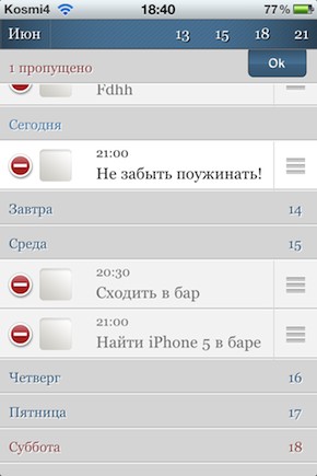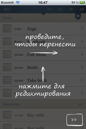 Для редактирования заметки необходимо один раз по ней тапнуть, а чтобы переместить ее в другой день или удалить — провести по ней пальцем справа налево. Не пугайтесь такого количества всевозможных функций, конфуз ощущается первые несколько минут, после чего пальцы привыкают.