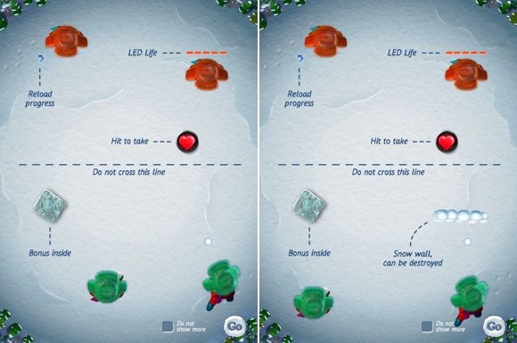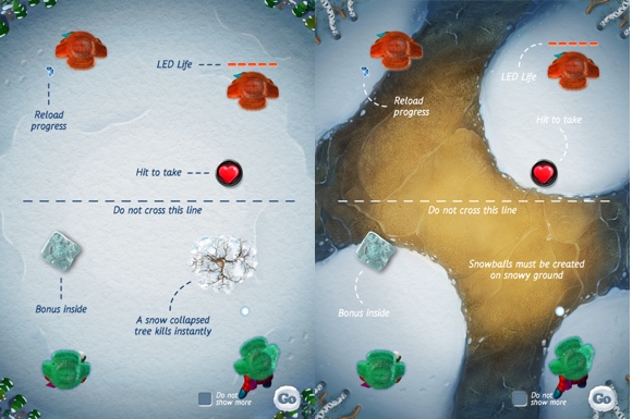 Кстати, чтобы добраться до этой подсказки, нужно во время игры нажать на паузу и потом на значок вопроса в углу появившегося меню. А вначале игры выводится немного другая информация, рассказывающая об общих правилах снеговой войны и особенностях текущего уровня.