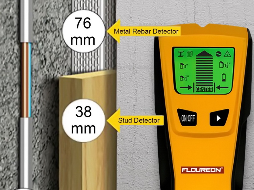 Работает до глубины 38 миллиметров при поиске небольших металлических предметов и до 76 миллиметров при поиске проводов под током.