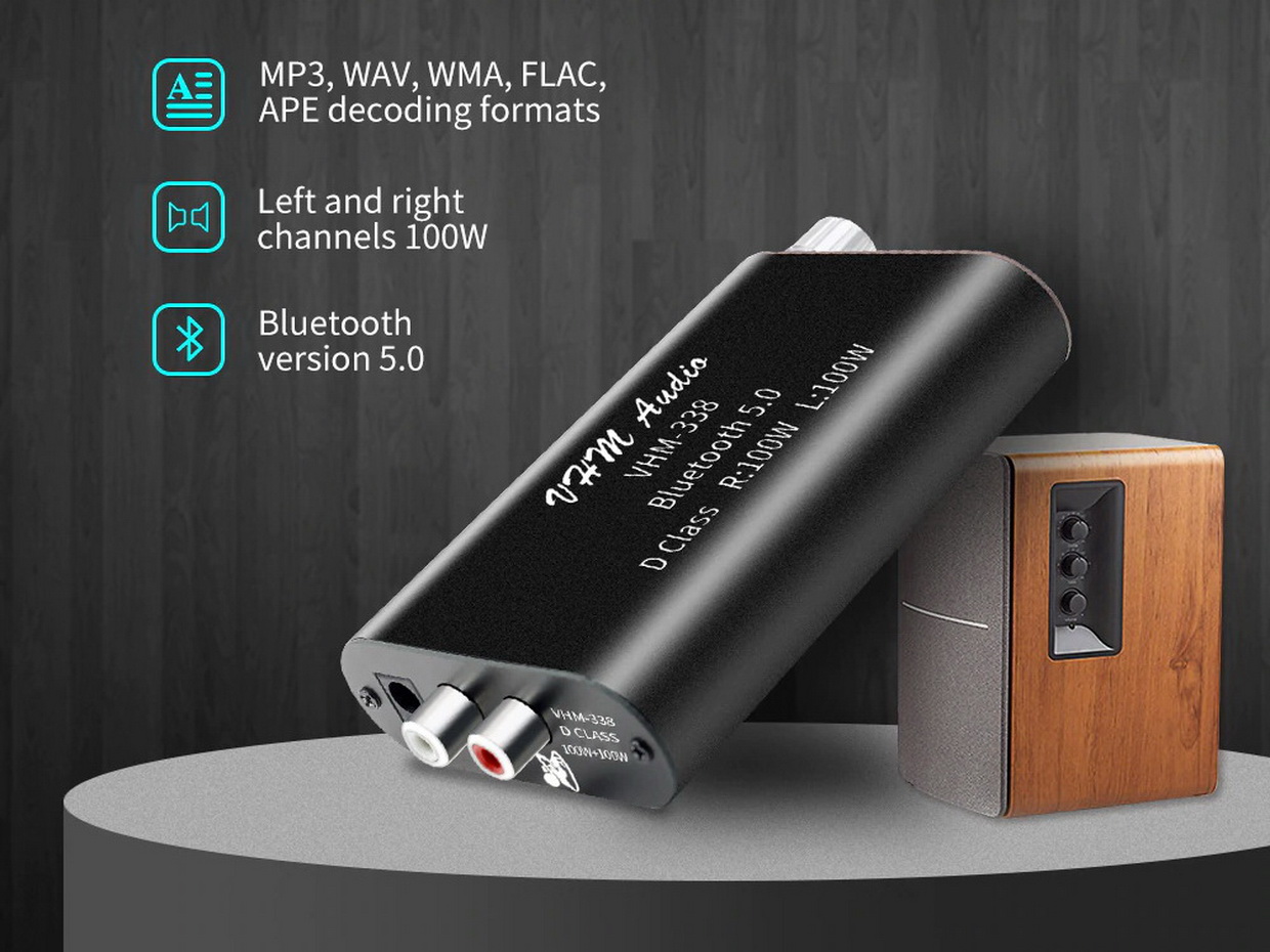 Маленький усилитель с мощностью до 100 ватт на каждый канал (их 2, стерео). Использует в качестве источника что угодно по Bluetooth, USB или AUX.