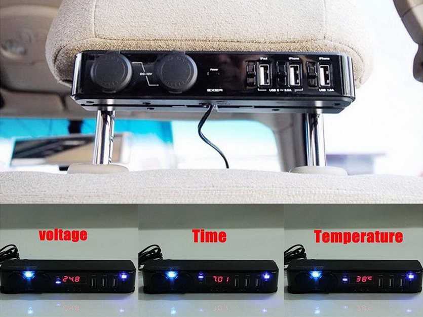 Продвинутый автомобильный удлинитель в прикуриватель с парой стандартных авторазъемов, тремя USB и дисплеем для управления подключенной по проводу музыкой.