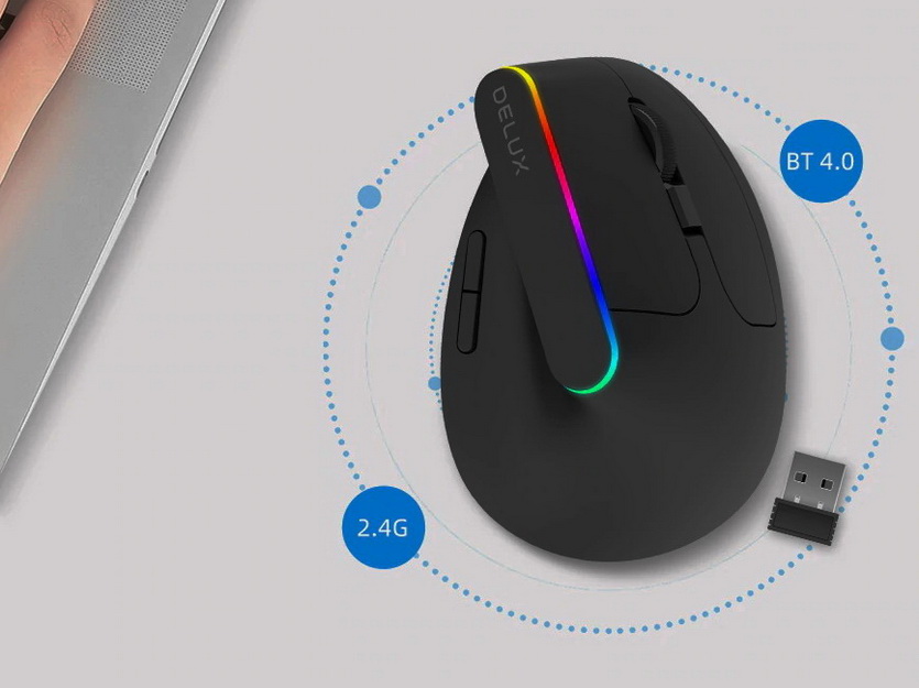 Простая бюджетная вертикальная мышь, позволяющая разгрузить запястье. Подключается по Bluetooth или с помощью USB-донгла. Есть RGB-подсветка.