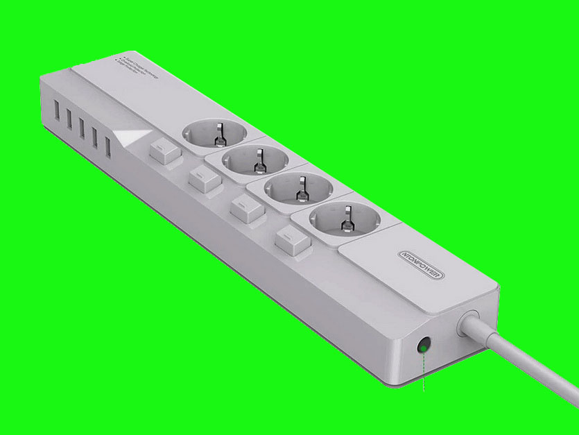 Неплохой вариант для единой домашней зарядной базы: 4 розетки на 220В переменного тока оснащены собственными выключателями и дополняются 5 USB-портами.