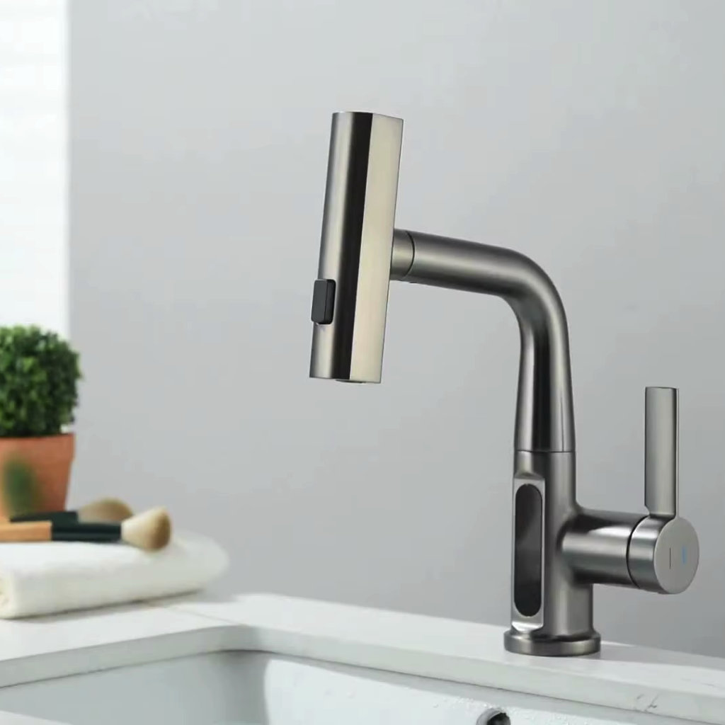 Стильный кран с индикатором температуры воды и тремя режимами подачи — точечным, водопадом и стандартным. Встроенная выдвижная лейка облегчает мытьё раковины и наполнение посуды. Доступен в чёрном, белом и хромированном исполнениях.